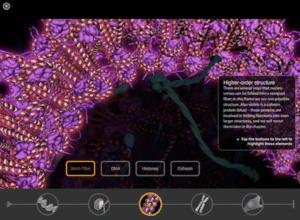 There’s some magic here. A 2-minute animation shows the process of chromosome separation during cell division. An image from a light microscope slowly undulates beneath the video as we see a cell ready to divide. Then the animation kicks in. A chromosome on the video image is highlighted, as if emerging from a mist. As we zoom onto this chromosome, we begin to notice the spindle fibers pulling from both sides. The video slowly focuses in on the spindle, as we notice the intricate protein machinery knitting away to extend it. The reader cannot escape the overall impression of enormous complexity deep within the cell, as processes that take minutes in a cell require a dance of millions of molecular interactions.