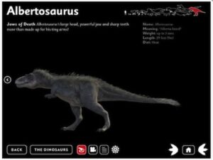 The other half of the app is a dinosaur database. Each of the story’s prehistoric creatures has their own entry. Most contain a few tidbits about when each animal was discovered, what they ate, and how they might have bred. The information is generally up-to-date, and, to the app’s credit, the mini-encyclopedia explicitly states that mosasaurs (marine lizards) and pterosaurs (flying archosaurs) were not dinosaurs. And, other than the text, the catalog includes short video clips from the show and the ability to slowly drag your finger to slow down the rotating, walking models of each dinosaur. It’s the closest you’ll ever get to Gorgosaurus doing an impression of Bo Derek in Blake Edwards’ 10.