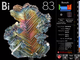 But let me briefly make a couple of other comparisons between this and its print version. Both do contain scientific data about each element (atomic number, weight, etc.) In the print book, of course, there’s a treasure trove of this right there on the page. In the e-version, there’s a compact summary but also much, much more through clicking on the Wolfram Alpha logo. You’ll see the logo in the toolbar at the lower right on the image of the Bismuth page I’ve shown above; it looks like a fancy red star. This represents one of the ongoing tradeoffs as we move away from print – there’s less likelihood of casual acquisition of information. But if we do seek out the online data, it’s likely to be more current and more detailed – Wolfram Alpha allows you to go beyond its own database through links to a host of additional scholarly sources.