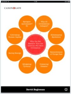 At least, that’s what I assumed before I read Why The Net Matters, Eagleman’s frustrating 2010 e-book about how and why the Internet will save civilization. (I reviewed the $7.99 iPad version, which is the platform it was designed for; a stripped-down, text-based version is available on the Kindle for the portentous price of $6.66.) The problems start with Eagleman’s premise, which is so vague and broad as to be practically meaningless. There are, he writes, just “a handful of reasons” that civilizations collapse: “disease, poor information flow, natural disasters, political corruption, resource depletion and economic meltdown.” Lucky for us (and Eagleman does offer readers “[c]ongratulations on living in a fortuitous moment in history”), the technology that created the web “obviates many of the threats faced by our ancestors. In other words…[t]he advent of the internet represents a watershed moment in history that just might rescue our future.”