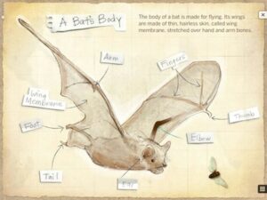 For a while, they were silent, making their way through the book. Anything that can stop a beach ball war gets some credit in my book. The girls got a quick lesson bat biology–how bats fly with membranes rather than feathered wings, how they hunt for insects. The book explained all the evidence showing that bats are mammals. Every point was amply illustrated. The pictures of the bats themselves come with explanations of the individual species. Special features include a sketch of a human skeleton with its hands stretched out to bat proportions. Touch it, and it flaps. The pages are arranged not as pages per se, but as stages in a panorama. Swiping the screen, the girls moved from place to place in the night forest.